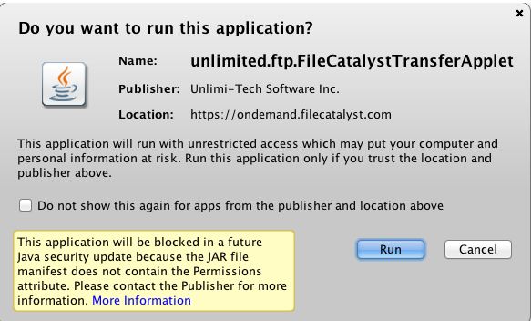 We have updated our Java applet that conforms to the new security policies. Please know that this applet is 100% safe and will do no malicious harm to your computer.
