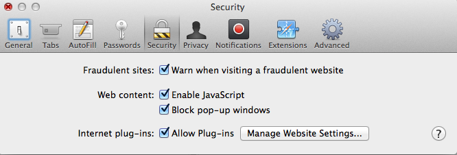 Security (tab) -> Internet plug-ins (Manage Website Settings)"